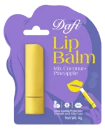 بالم لب دافی، با طعم آناناس نارگیل، با دارا بودن SPF15 از لب‌ها به طور کامل محافظت کرده و از خشک شدن و ترک خوردن آن‌ها جلوگیری می‌کند. این بالم لب خاصیت مرطوب‌کنندگی داشته و لب‌های خشک را آبرسانی می‌کند. این محصول از لب دربرابر آسیب‌ها محافظت کرده و در صورت بروز آسیب موجب ترمیم و بهبود آن می‌شود. بالم لب دافی سرشار از مواد مغذی بوده و استفاده از آن، در طولانی مدت، لب‌ها را صاف و ابریشمی می‌کند. این محصول برای استفاده آقایان و خانم‌ها و همچنین تمام سنین مناسب است.